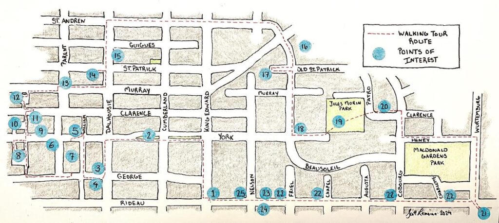 (25) Pop in at All Books to find the perfect summer read or check what’s playing at the Bytowne, but before you do, take a look at the Mique Michelle and DRPN Soul collaboration on the side of the theatre. The words “L’avenir est a ceux qui luttent” to the bottom left bear a secret and special connection to stop 4. It was the motto of Le Droit newspaper, founded in 1913 to mobilize against Regulation 17. Here, the woman holding a feather and the man at the microphone evoke other struggles for recognition, respect, and self-determination.