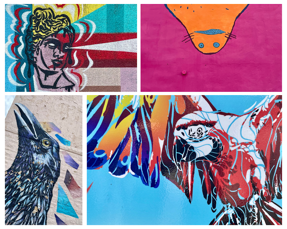 (22) Cross back to the north side of Rideau (where the mural is). At each intersection, look out for the utility boxes wrapped in bold graphic designs. Can you spot Audrey Hepburn at Charlotte, parrots at Cobourg, pink elephants at Chapel, and rhinos and tigers at Friel?
