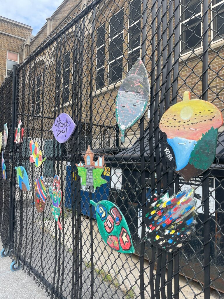 This spring, students collaborated to create a mural to make the outdoor space their own. Students painted designs on large wooden leaf cutouts, which now adorn a fenced area in the yard, turning it into a vibrant gallery.